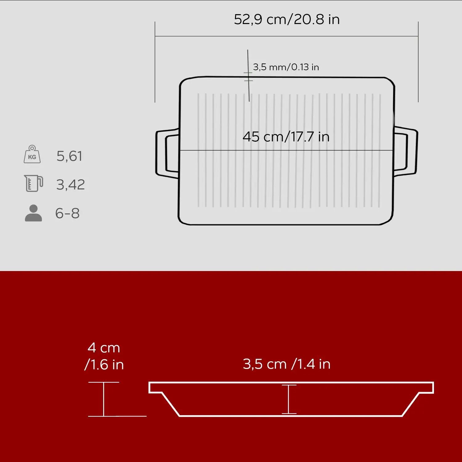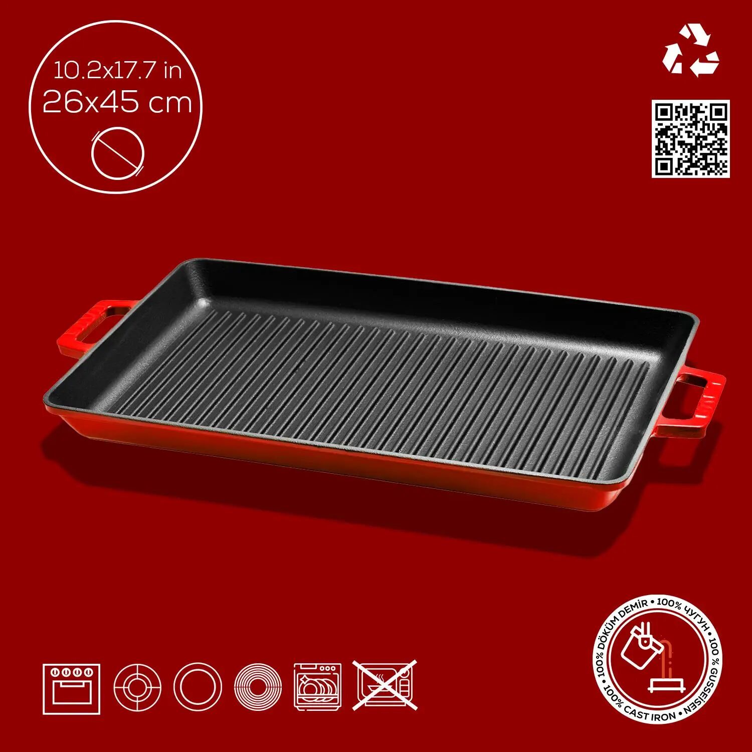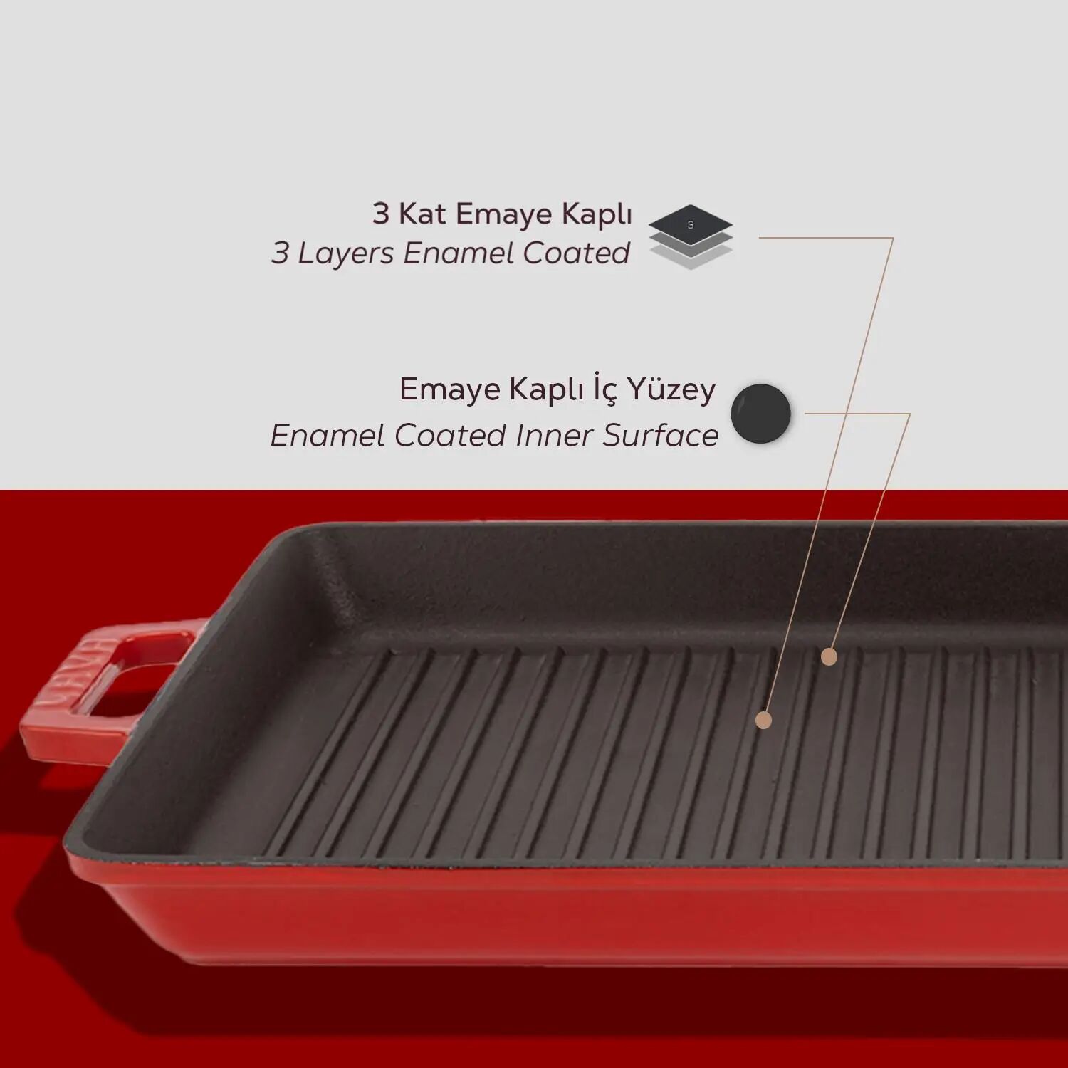 Lava Döküm Dikdörtgen Izgara Tavası Döküm Demir Yekpare Çift Kulplu Ölçü 26x45cm. - Kırmızı